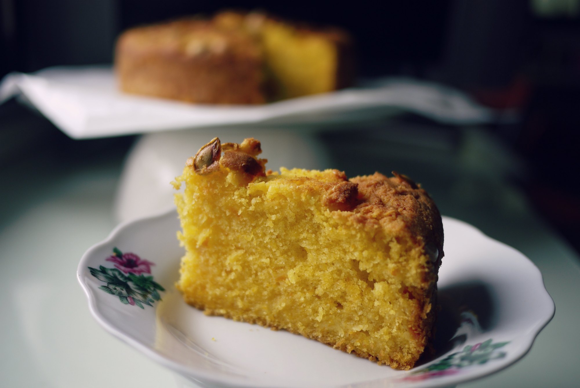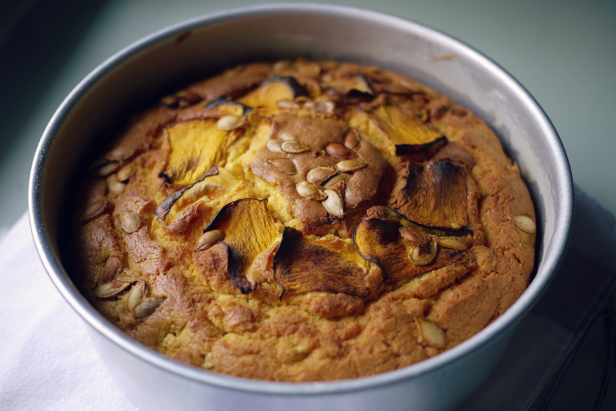 recipe adapted from here yields an 8 inch cake 250g salted butter, softened 150g sugar 3 large eggs 150g steamed pumpkin, cooled and mashed 300g self raising flour 20g corn flour 60g milk 150g pumpkin, peeled and diced optional : pumpkin slice and seeds for topping