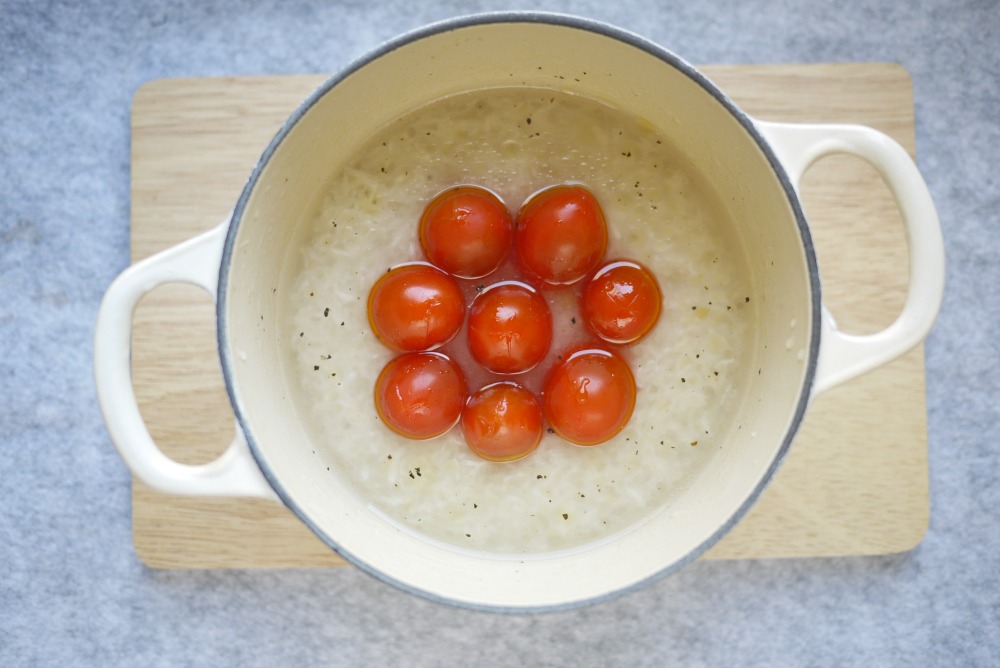 I am using cherry tomatoes to make this single serving tomato rice instead of a whole tomato like this.