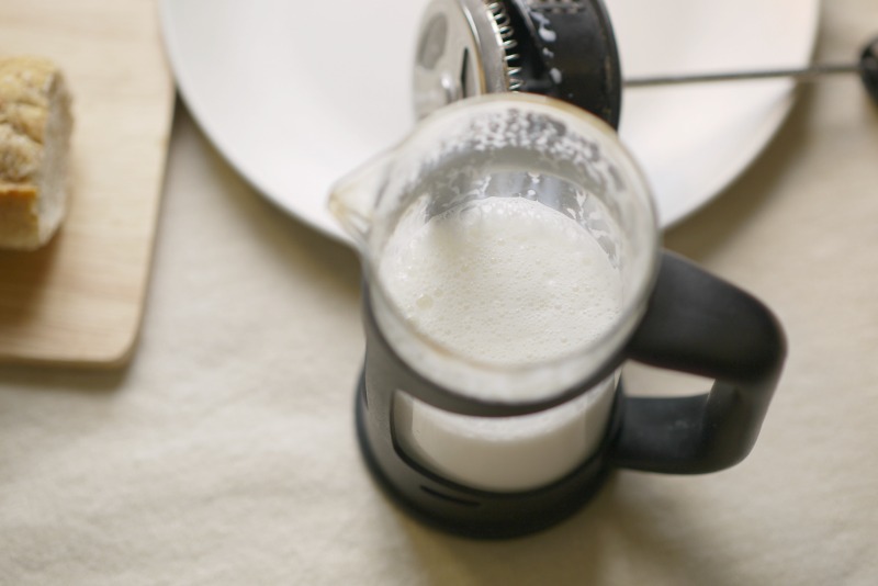 03. Pour the milk into a french press, cover, and press the plunger for about 20 to 30 times to aerate the milk.*