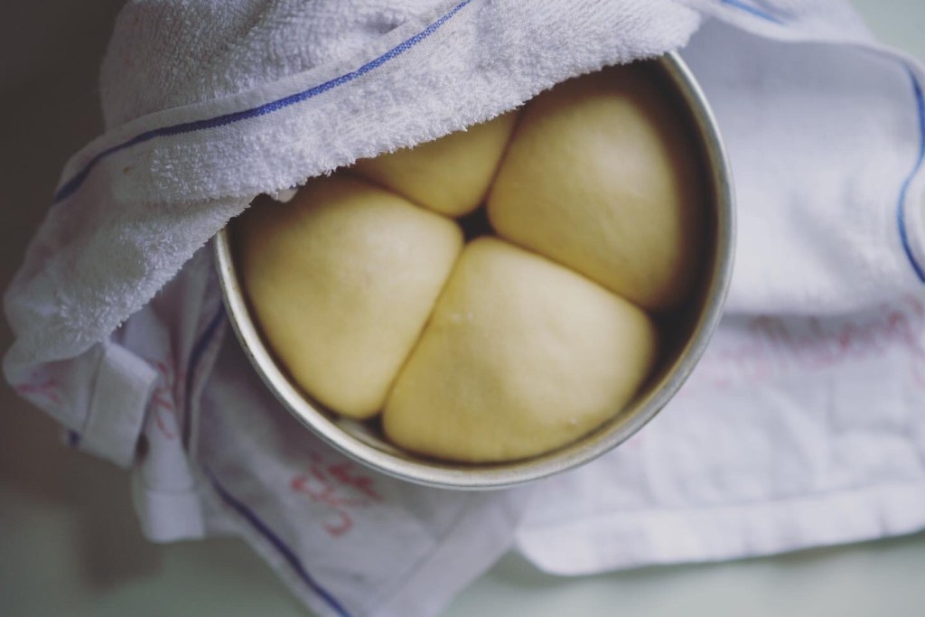 Flatten the dough to push out gas trapped inside the dough, either by hand or a rolling pin. The dough is quite sticky, flour hands and worktop with flour to help with shaping. Shape the dough into a log and place it in a greased bread tin, seam side facing downwards. Let this sit in a draft-free place to rise for another 50-60 minutes. Optional: dust flour on bread top.