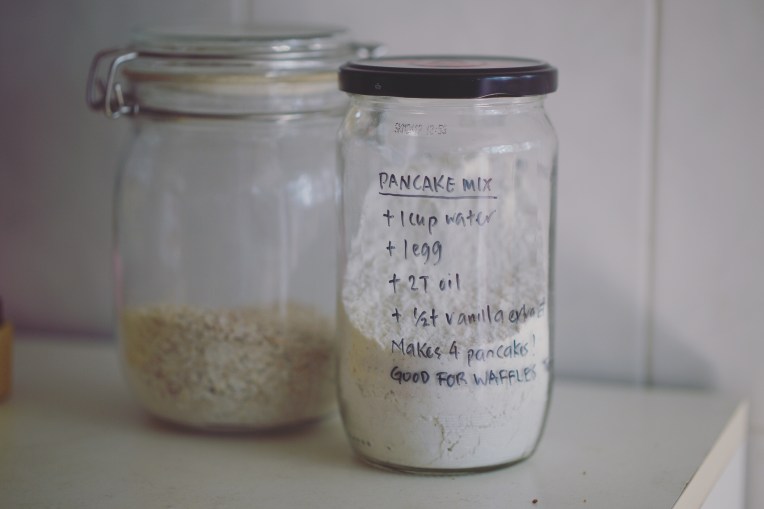I have found another use for my recycled pasta sauce glass jars; storing pancake mix! When ready to cook, simply add the list of wet ingredients scribbled on the bottle, cover lid and shake to mix into batter. How convenient!