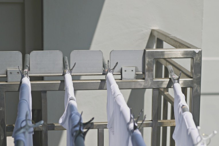 // The homeowner appreciates this generous outdoor laundry drying rack design that seems to have disappeared in the newer flats. Solar power is free!