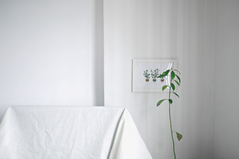 // Indoor greens, planted or drawn, are placed around the house for a soothing effect.